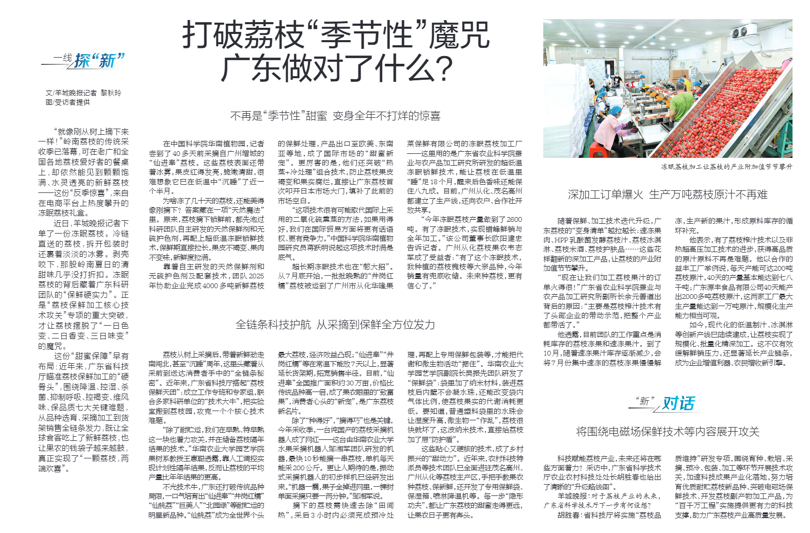 胡胜春:省科技厅将实施“荔枝品质维持”研发专项,围绕育种、栽培、采摘、预冷、包装、加工等环节开展技术攻关,加速科技成果产业化落地,努力培育优质耐贮荔枝新品种、突破电磁场保鲜技术、开发荔枝副产物加工产品,为“百千万工程”实施提供更有力的科技支撑,助力广东荔枝产业高质量发展。